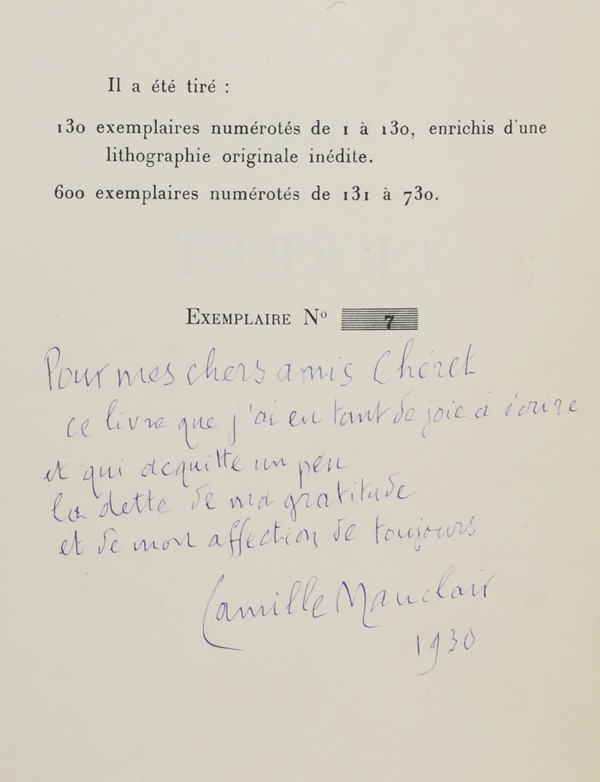 Important envoi autographe de l'auteur : "Pour mes amis Cheret, ce livre que j'ai eu tant de joie à écrire et qui acquitte un peu la dette de ma gratitude et de mon affection de toujours. Camille Mauclair 1930".