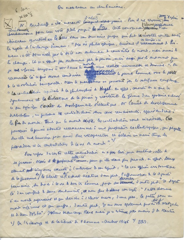 Manuscrit autographe signé de ce texte d'hommage à Nicolas Berdiaeff (1874-1948) intitulé "Du marxisme au christianisme" comprenant quelques corrections autographes et complet du dernier paragraphe qui sera coupé lors de sa parution dans Combat (cf. LAS jointe) le 26 mars 1948.