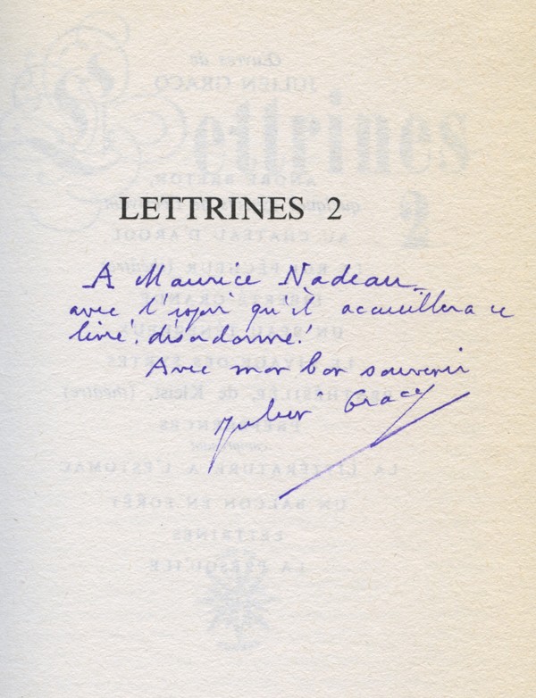 Envoi autographe signé : "A Maurice Nadeau, / avec l'espoir qu'il accueillera ce / livre ! désordonné ! / Avec mon bon souvenir / Julien Gracq".
