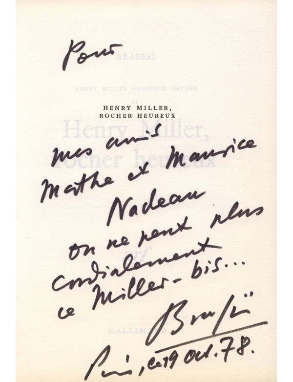 Envoi autographe signé de l'auteur : "Pour / mes amis / Marthe et Maurice / Nadeau / on ne peut plus / cordialement / ce Miller-bis... / Brassaï / Paris le 19 oct. 1970".