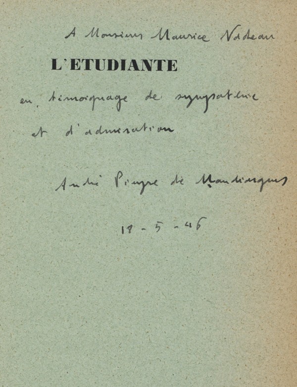 Envoi autographe signé de l'auteur : "A Monsieur Maurice Nadeau, / en témoignage de sympathie / et d'admiration / André Pieyre de Mandiargues / 18 - 5 - 46".