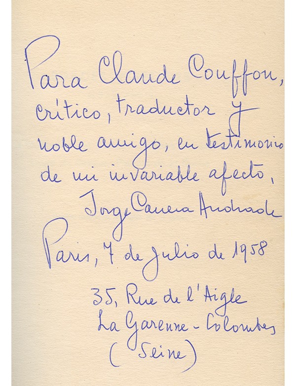 Très bel envoi autographe signé de l'auteur : "Para Claude Couffon, / critico, traductor y / noble amigo, en testimonio / de mi invariable afecto, / Jorge Carrera Andrade / Paris, 7 de Julio de 1958 / 55, Rue de l'Aigle / La Garenne-Colombes / (Seine)".