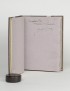 Les Minutes de sable mémorial : 15,5 x 12 cm, demi-maroquin aubergine à bandes, dos lisse titré or, papier couché noir serti d'un large filet doré sur les plats, gardes de papier identique, couverture noire (premier plat illustré d'un blason doré) et dos conservés (reliure signée de Huser), 2 ff. blancs, 3 ff. n. ch. (blason, titre, faux-titre), 210 pp., 5 ff. n. ch. (errata, bois à pleine page, marque d'imprimeur, 2 ff. blancs)