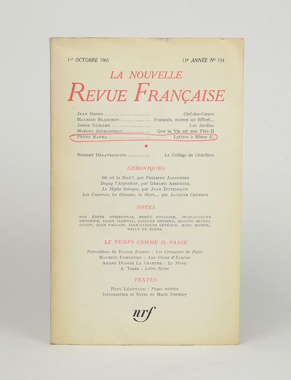 Pré-originale française de ces treize lettres adressées à Minze E., jeune fille rencontrée à la pension Stüdl en 1919, dans le n° 154 de la Nouvelle N.R.F. en octobre 1965 (pp. [635]-662) précédée d’une introduction.