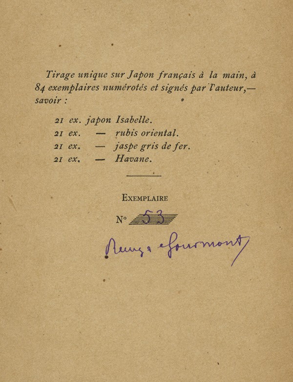 Tirage limité à 84 exemplaires, composé de 4 tranches de 21 exemplaires, tous imprimés sur Japon de différentes couleurs : isabelle, rubis oriental, jaspe gris de fer et havane.