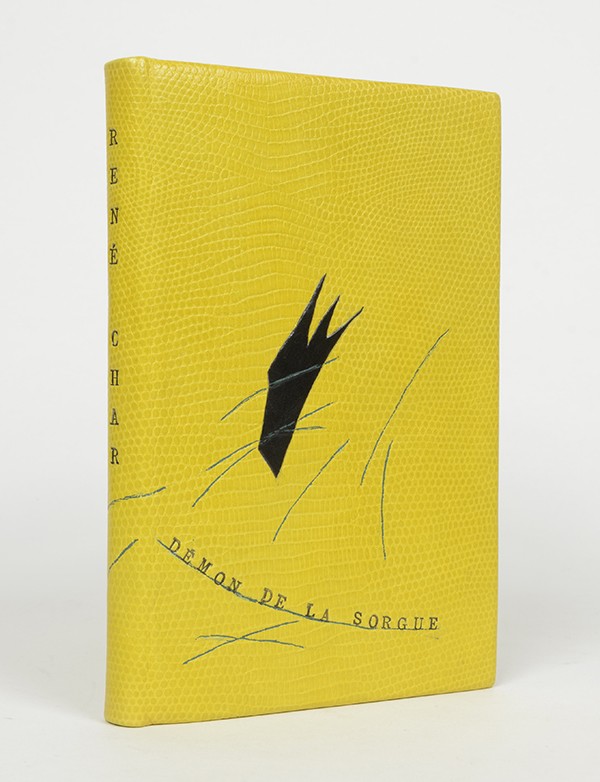 In-32 (14,8 x 9,5 cm), reliure en plein lézard moutarde, dos lisse portant le nom de l'auteur poussé à l'œser noir à la chinoise, décor sur les plats constitué de filets noirs figurant des roseaux, pièce de box noir et "Démon de la Sorgue" poussé en noir sur le premier plat et "Déguisé en roseau" sur le second, couverture et dos conservés (reliure signée M.-P. Abiven), 8 ff. n. ch. (3 blancs, faux-titre, frontispice, titre, préambule, faux-titre), 33 pp., 3 ff. n. ch., étui-chemise